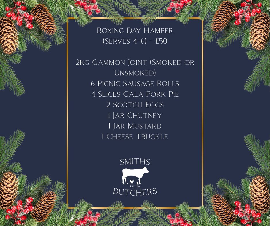 Keep the festive spirit going with our Boxing Day Hamper, perfect for a relaxed graze after the big day. This ready-to-enjoy selection features a 2kg gammon joint (choose smoked or unsmoked), plus a spread of savoury favourites — picnic sausage rolls, gala pork pie slices, Scotch Eggs, chutney, Mustard, and a Cheese truckle to finish it off.